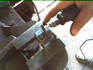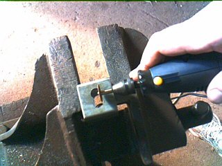 As indicated in the plans, using the drill press, drill two 12mm holes, 10mm apart on each side of the sleeve. Then using the fine cut-off saw on the rotary tool at about 5000rpm, cut out the left over metal in the middle. To do this job you need to brace your hand against the vice, and while holding the rotary tool firmly with both hands, you have to apply only the lightest amount of pressure. It requires the deftest touch, if the blade catches, it shatters into pieces. Once you get the hang of it, its pretty easy -- like all things delicate, you just have to be patient.