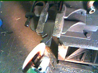 Now keeping the pieces clamped together use the cut off saw on the angle grinder to cut the quick release slots. To do this you need to place the work in a big vice. Hold the grinder firmly with both hands, keep your feet apart so you have good balance and apply gentle pressure. Make sure you keep the cut off saw square to the work and the center of the saw above the work so the blade doesn't bite. If its too low, it will bite and really kick, quite dangerously, so be careful and ware all the appropriate safty gear.