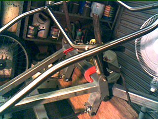 Here you can see the rear seat mount being tack welded in three places. I tacked all the mounts, then took the seat off and repositioned it to make the final welds easier to perform. The stainless is pretty easy to weld, you just have to watch the heat. As with all thin tube welding there is a risk of burn through, so you have to keep the weld pool on the tube, and then let it melt into the butted material.