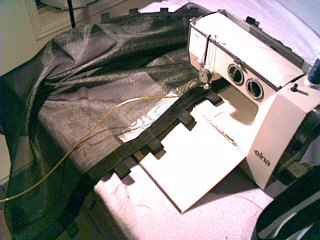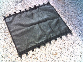The mesh seat cover is made from a single piece of nylon reinforced mesh 830 x 650mm. It has a gusset of 32mm wide webbing (used to make straps) sewn front and back along each side. Ten eyelets made from 25mm wide webbing, each 100mm long are folded and sewn 90mm apart down the left and right side. These will be laced with shock cord like a shoe lace to attach the mesh cover the the seat frame. Inside each of the side gussets is also a selvage (YELLOW) made from rubber coated, wire core, clothes line cord. This helps to stiffen the sides and support the weight more evenly. I used a heavy upholstery thread to sew this using a 100 needle.