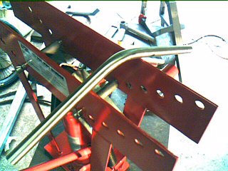 There are several things you really must get right with the seat frame. Firstly you must mirror the bends as closely as possible. To do this I ended up welding two 4" nails to the pivot plates on the pipe bender (shown below). I found that if I measured the distance between the tips of these nails once I got the angle right, I could repeat the bends. The final thing that is critical is making sure that the seat is mounded square, centered and level to your frame.