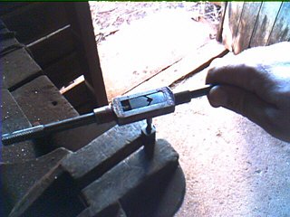 As indicated in the plans, using the drill press, drill two 12mm holes, 10mm apart on each side of the sleeve. Then using the fine cut-off saw on the rotary tool at about 5000rpm, cut out the left over metal in the middle. To do this job you need to brace your hand against the vice, and while holding the rotary tool firmly with both hands, you have to apply only the lightest amount of pressure. It requires the deftest touch, if the blade catches, it shatters into pieces. Once you get the hang of it, its pretty easy -- like all things delicate, you just have to be patient.