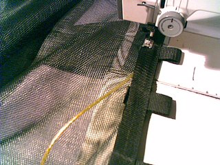The mesh seat cover is made from a single piece of nylon reinforced mesh 830 x 650mm. It has a gusset of 32mm wide webbing (used to make straps) sewn front and back along each side. Ten eyelets made from 25mm wide webbing, each 100mm long are folded and sewn 90mm apart down the left and right side. These will be laced with shock cord like a shoe lace to attach the mesh cover the the seat frame. Inside each of the side gussets is also a selvage (YELLOW) made from rubber coated, wire core, clothes line cord. This helps to stiffen the sides and support the weight more evenly. I used a heavy upholstery thread to sew this using a 100 needle.