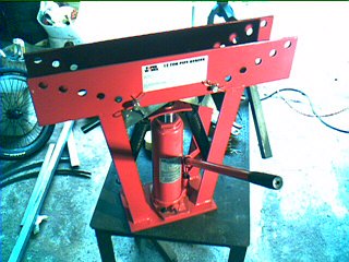 To bend the seat rails and braces I used my modified 12ton hydraulic pipe bender. It is overkill for light pipe like this, but its all I have. The nice thing about this bender is all you have to do is place a line where you want the bend, center it in the bender and measure the angle between the plates, once it is reached the bend is complete and centered right on your line.