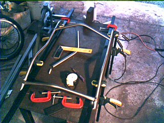 Once the braces are done, you need to square up your seat rails and clamp them so you can tack weld the braces on. To do this I used two lengths of RHS that I ran down each side of my work bench. At this end you may see the chalk line I used the line up the top of each rail. The braces were positioned and held in place with a large clamp, then tack welded. Once they were all tack welded, I turned the seat over ant tacked the other side, before doing the final welds.